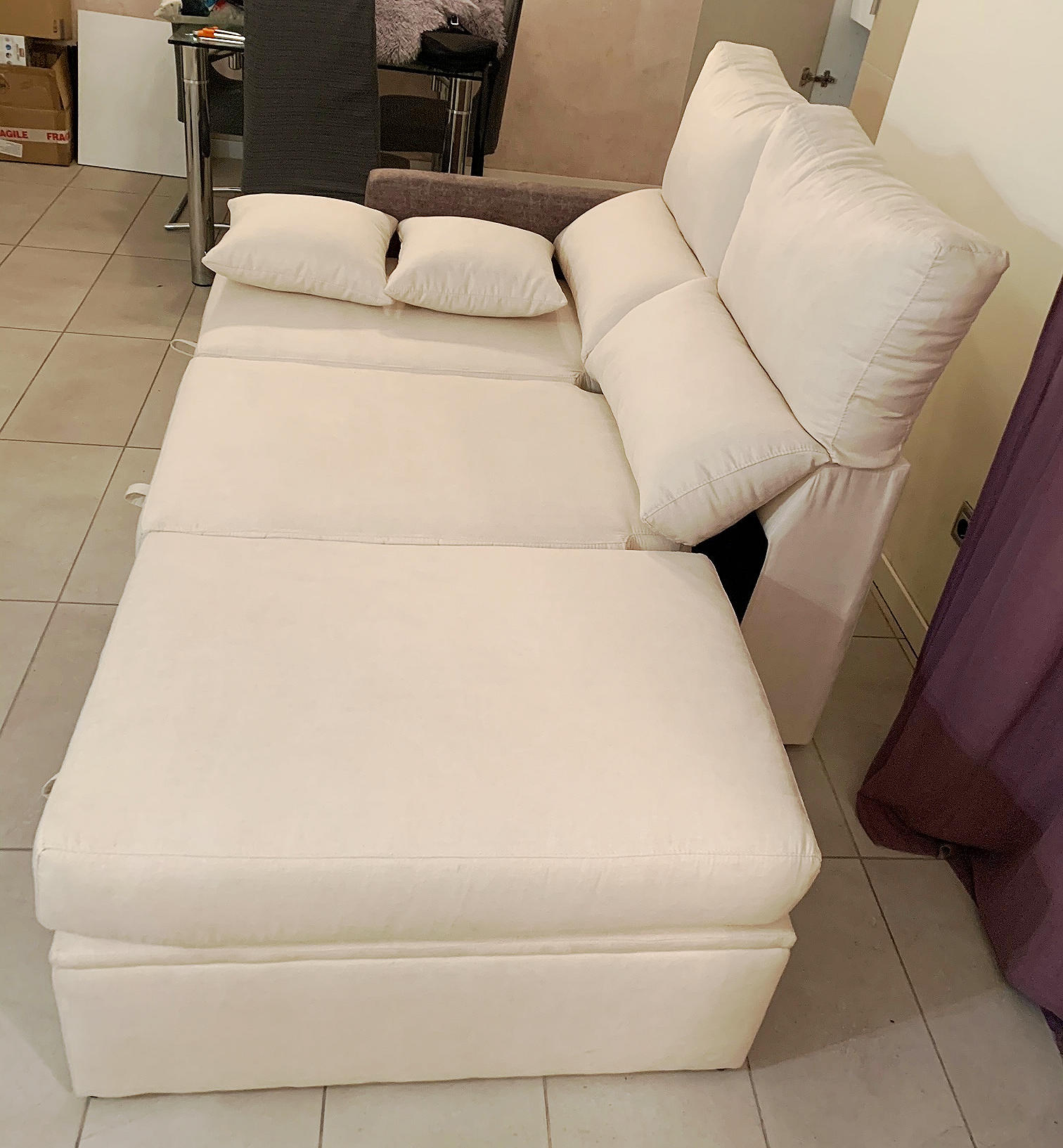 Composición modular en la vivienda del cliente con terminal lateral en formato puff e interior arcón. Esta configuración única combina el confort de un sofá con la versatilidad de un puff con almacenaje, adaptándose perfectamente tanto con el mecanismo abierto como cerrado.